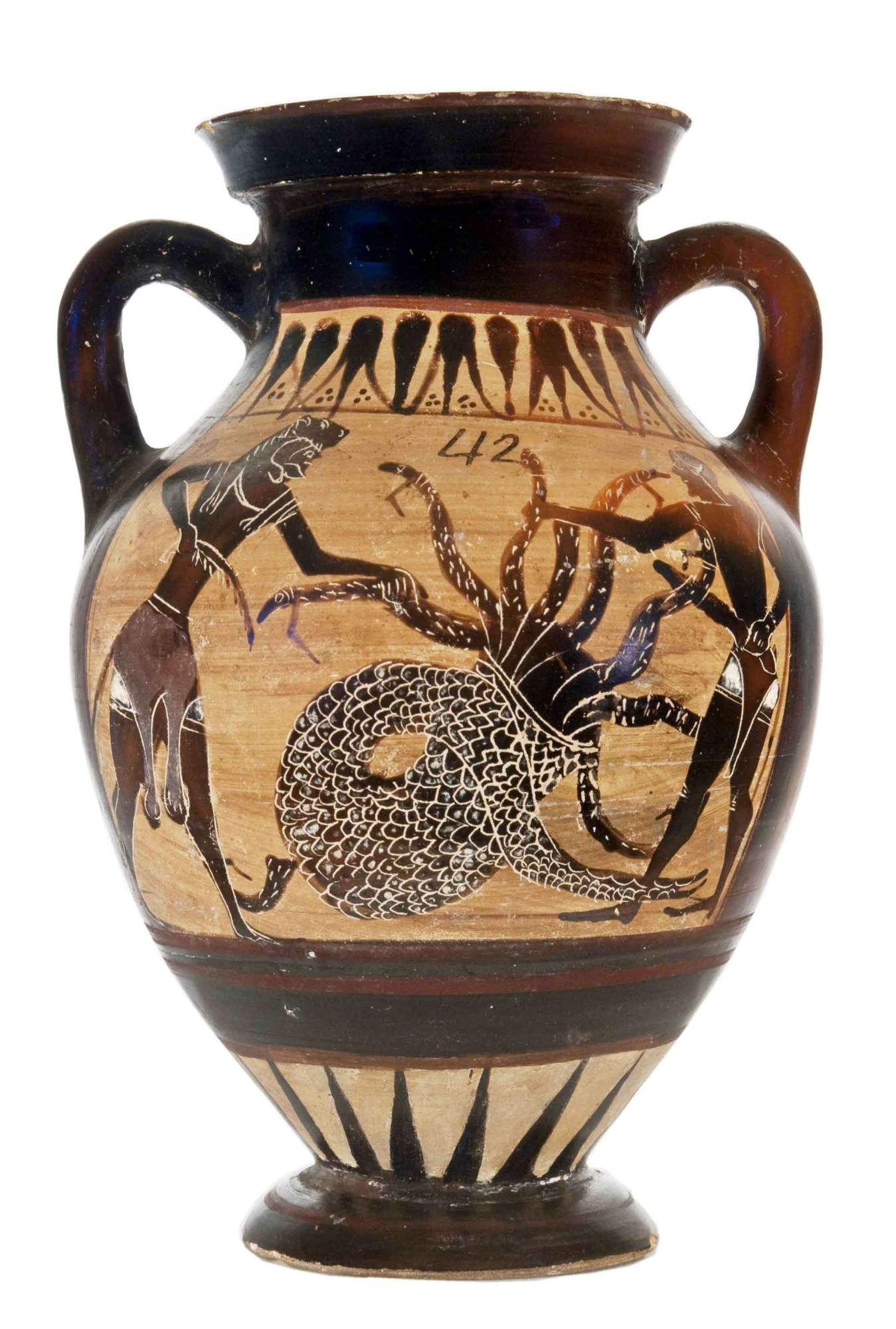 Piccola anfora a figure nere con colori aggiunti e graffito. Lato A: Il centro è occupato dall’Idra, il mostro dal corpo anguiforme a scaglie arrotolato e dalle molte teste; a sinistra, Eracle, coperto dalla leonté, afferra una delle teste del mostro per reciderla con la spada dentata, mentre ai suoi piedi ce n’è un’altra tagliata; lo aiuta, sulla destra, il giovane Iolao, pure egli armato di spada. Lato B: L’eroe della guerra di Troia, Aiace, armato di lancia è stante con indosso la corazza, gli schinieri e una pelle di pantera, si rivolge verso il centro della scena, dov’è il Palladio, l’immagine sacra di Atena, dall’elmo con alto lophos, egida a serpentelli e lungo chitone, armata di lancia e grande scudo rotondo; sotto ad esso, cerca di nascondersi Cassandra, dalla figuretta seminuda. Uno spettatore osserva la scena, a destra.