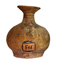 Aryballos a corpo globulare (senza ansa?) scanellato nella parte superiore del ventre; decorazione bruna e uso del graffito.