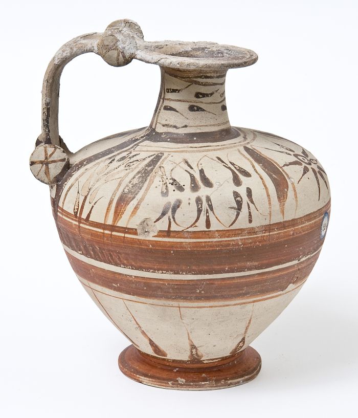 Brocca in ceramica messapica. Labbro largo e orizzontale, ventre piriforme rastremato verso il basso, collo cilindrico a profilo concavo, ansa a nastro sormontante con rotelle alle estremità. Decorazione a vernice monocroma rosso-bruna. Sul collo, foglie stilizzate separate da una linea orizzontale; sulla spalla, riquadri separati da linee verticali con motivi vegetali all’interno (palmetta, due file di fiori campaniformi, rosa); sul corpo, due ampie fasce parallele interamente campite a vernice rossastra e foglie stilizzate disposte a raggiera dal fondo verso l’alto; campitura rossastra sull’orlo e sul piede; linee radiali sulle rotelle e fiori campaniformi sull’ansa.