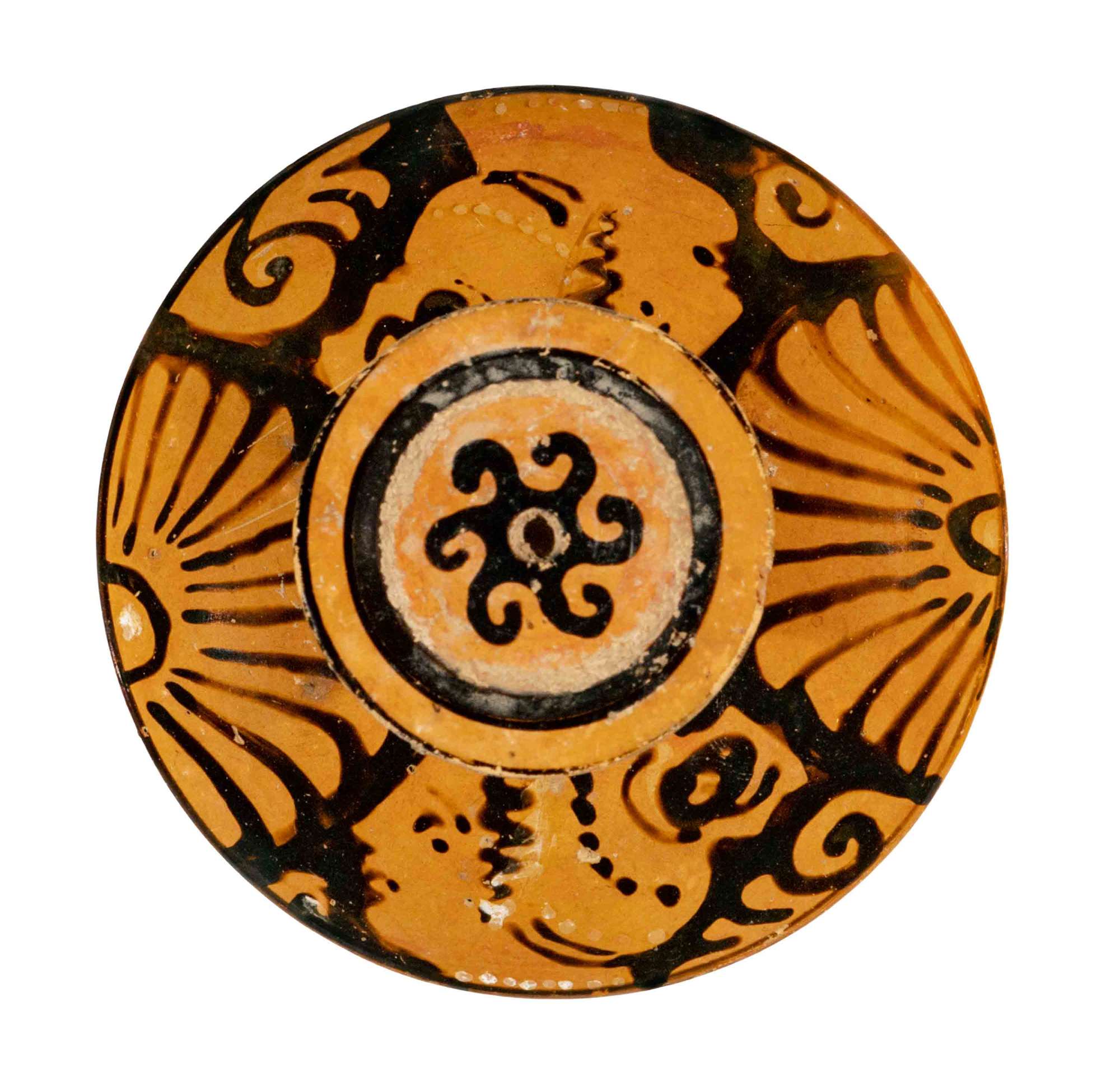 Coperchio di lekanis apula a figure rosse con presa a disco; Lato A e B: testa femminile con mitella tra palmette.