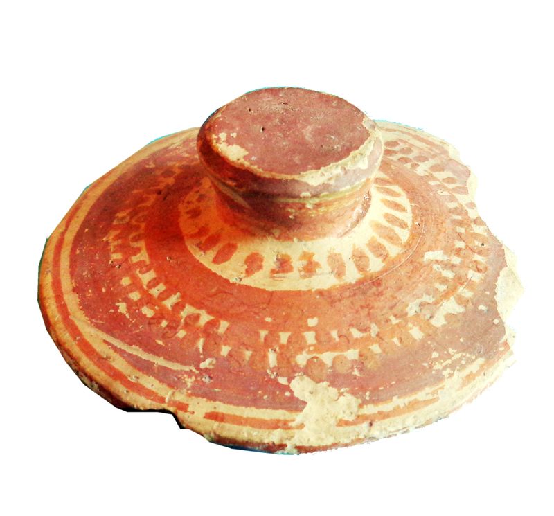 Coperchio con piccola presa a fasce rosse concentriche che delimitano una a scacchiera, presa verniciata e alla sua base trattini a raggiera.