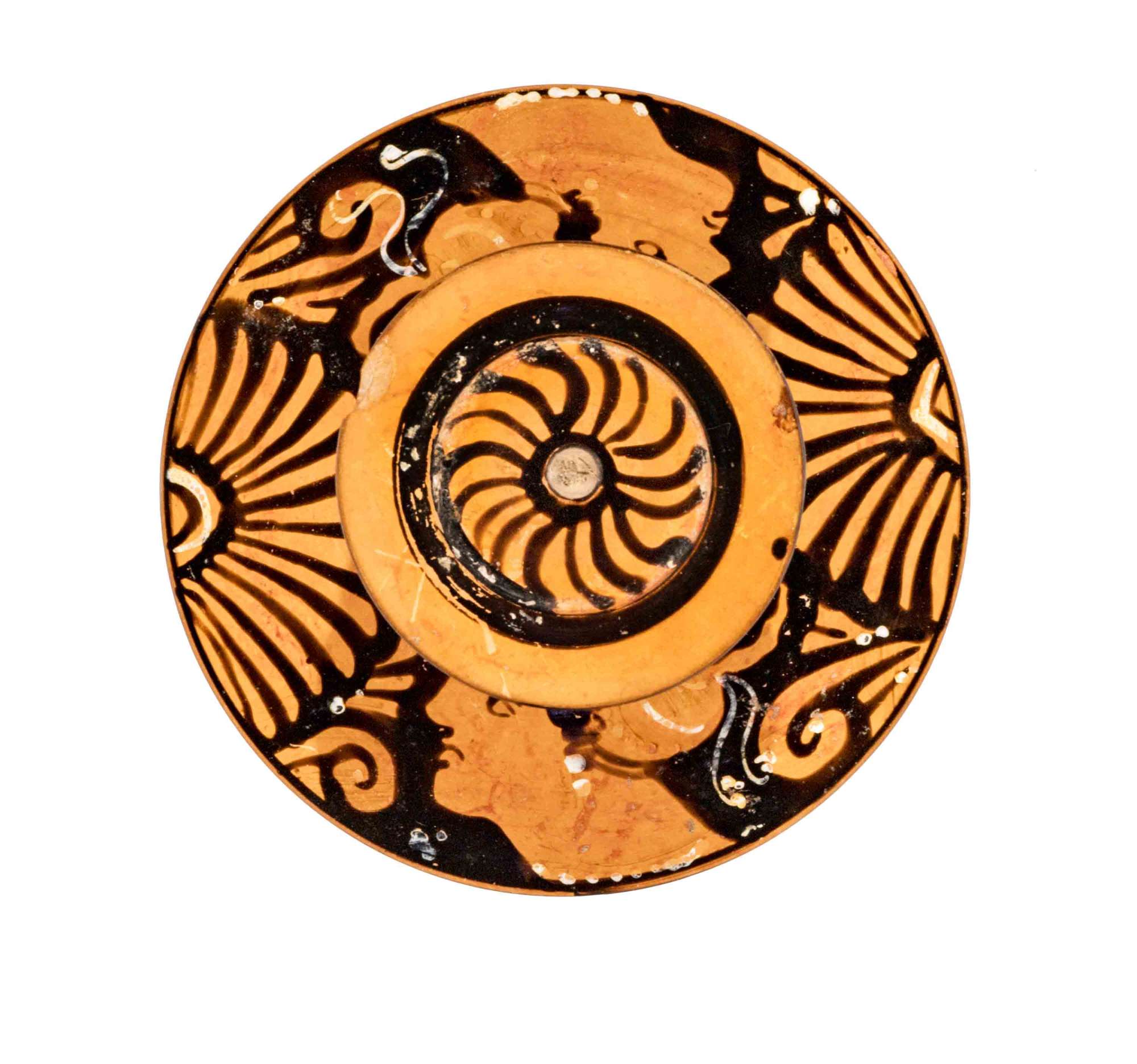 Presa con orlo revoluto a profilo concavo; tondo centrale leggermente ribassato, con tondello mediano incavato; Sulla presa, entro due circonferenze concentriche a vernice nera, motivo a raggiera con raggi ondulati; circonferenza superiore della presa a risparmio; bordo verticale della presa verniciato; stelo decorato con fascia mediana campita in nero. Parete inferiore della presa all’attacco con lo stelo, appoggio e interno della calotta lasciato totalmente a risparmio. Ai lati dei due quadranti metopali, palmette speculari con foglie squadrate alle estremità, unite da calice centrale triangolare o semi-circolare a risparmio con linea nera mediana e profilato superiormente in bianco. Le palmette sono accompagnate ai lati da infiorescenze triangolari, puntinate in bianco. Coppia speculare di teste femminili con mitra alternate alle palmette.