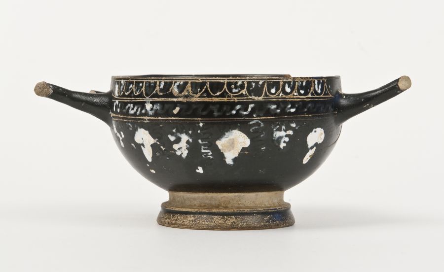 Cup skyphos a vernice nera lucente con sovraddipinture in bianco, giallo e incisioni. Orlo leggermente estroflesso, vasca emisferica, anse a bastoncello (sormontanti l'orlo), gola di raccordo, piede troncoconico. Lato A: tra tre coppie di linee incise, ovuli incisi e dipinti con punti, meandro merlato, grappoli, pampini, viticci e germogli in bianco-giallo. Lato B: Tralcio di edera con stelo lineare inciso e foglie cuoriformi.