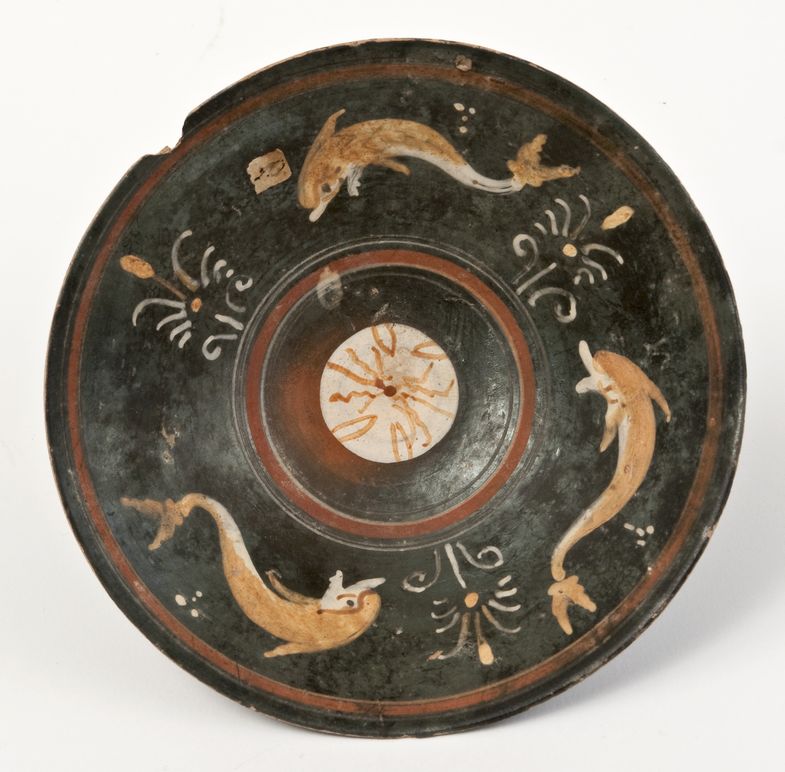 Coppa emisferica con pesci a vernice nera, a tratti più chiara e tendente al rosso, con sovraddipinture in bianco crema, giallo ocra e rosso amaranto ed incisioni. Orlo dritto, con doppia scanalatura al di sotto, vasca poco profonda, apoda. Interno della vasca: stella o fiore dai petali aperti ed espansi sovraddipinta su un bottone centrale. Sulle pareti tre delfini alternati a tre palmette con fiori di loto. I solchi incisi vanno a distinguere l’orlo dal corpo ed il fondo delle pareti della vasca, rimarcati da fasce in rosso amaranto.