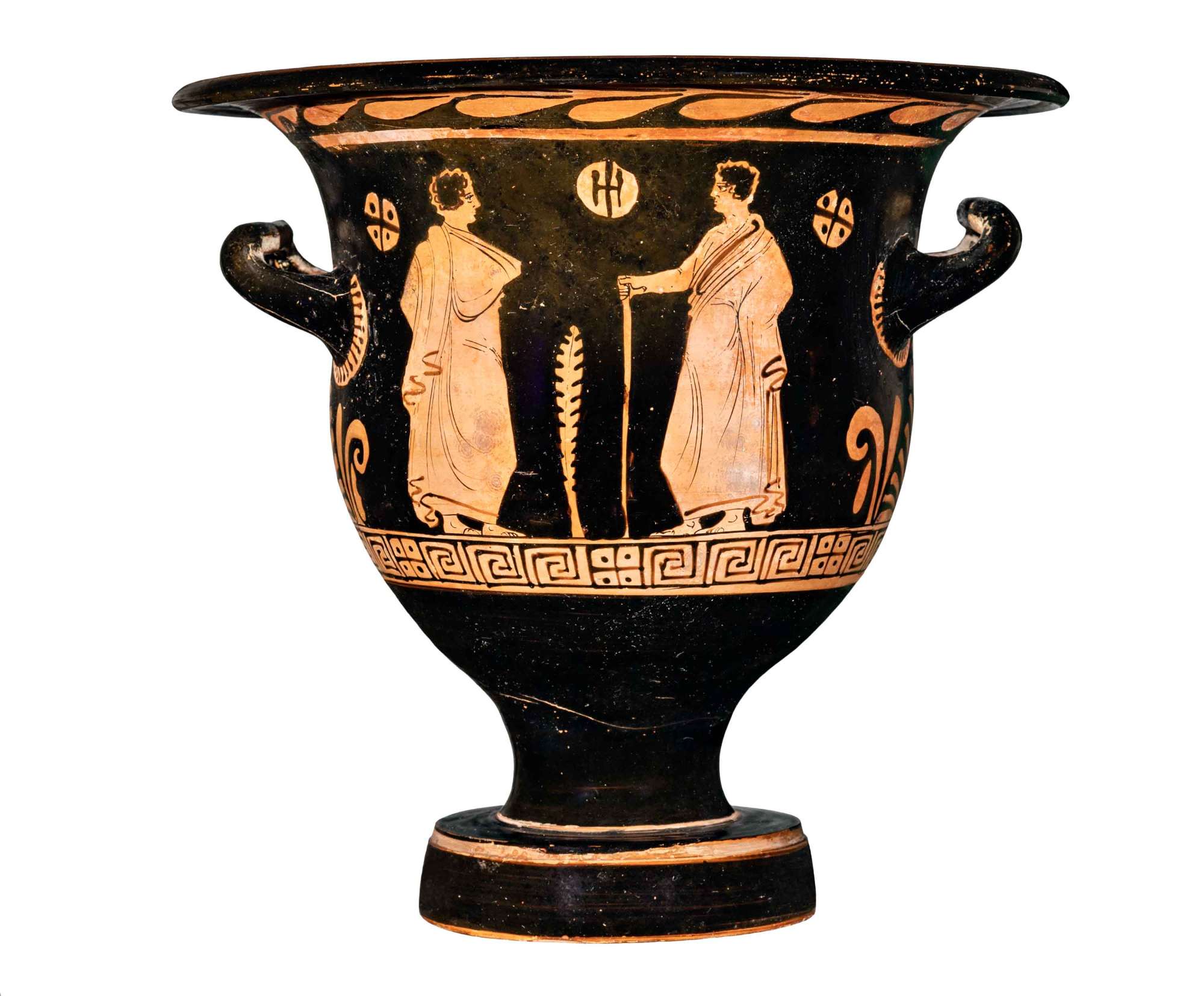 Catere a campana apulo a figure rosse. Lato A: giovane nudo in piedi con tirso e patera, altro giovane nudo seduto con tirso. Lato B: due giovani ammantati di cui uno con bastone.