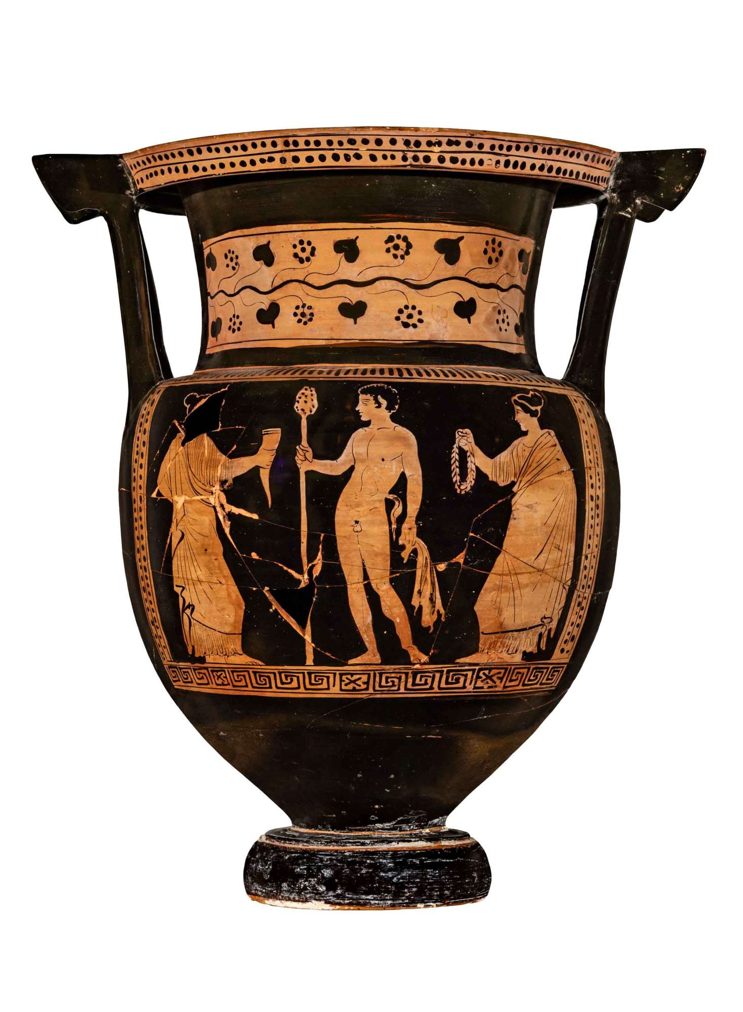 Cratere a colonnette apulo a figure rosse. Lato A: partenza di guerrieri, donna stante con offerte, guerriero seduto con spada e lancia, donna stante offerente, guerriero con scudo e lancia. Lato B: satiro tra due menadi con corno potorio.
