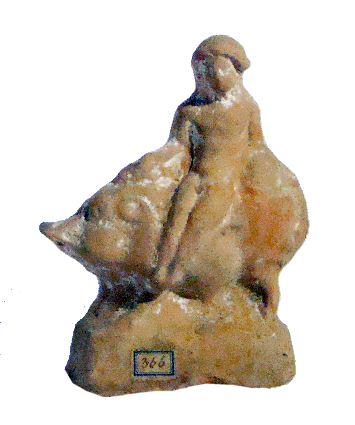 Statuina in terracotta realizzata a matrice. Base ovoidale cava. Riporta un'etichetta con il numero "366", sul retro è apposta un'altra etichetta con la dicitura in corsivo "Rudiae Ostr. 257". Sul retro la scritta a matita "366" e in rosso "5107". Retro appena lavorato. Giovane figura maschile nuda seduta su un quadrupede, identificabile come un maialino o un cinghiale. Appena leggibili i particolari della figura umana; capigliatura folta. Curati i dettagli anatomici dell'animale: orecchio a punta, cresta, muso prominente.