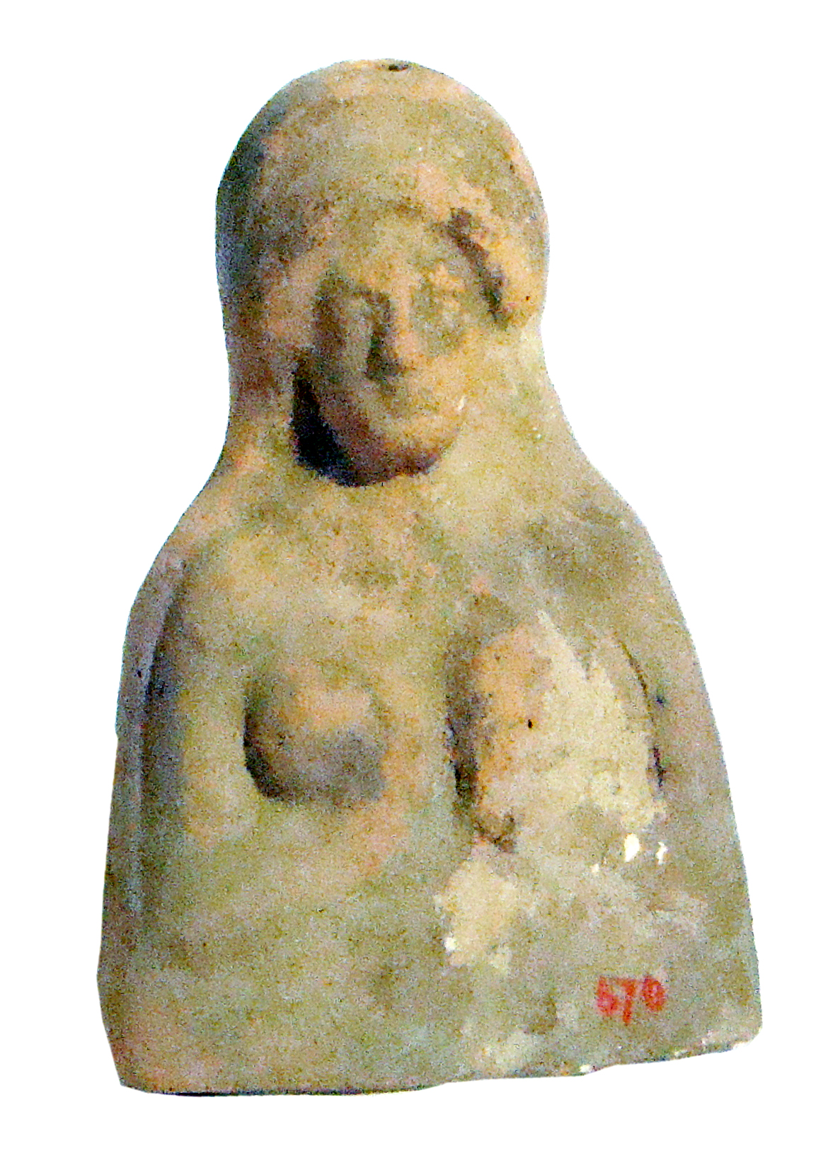 Figura di donna con le mani al petto; seni nudi. La figura indossa un lungo chitone che copre le spalle. Le mani piegate verso l’interno, forse la mano sinistra regge un lembo del mantello. La testa cinta di polos, il volto è caratterizzato dall’ovale largo con i tratti somatici non ben definiti.