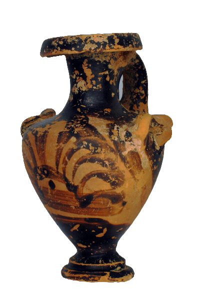 Orlo estroflesso con labbro ripiegato, obliquo per difettosa modellatura verso sinistro rispetto al collo; collo a profilo leggermente concavo. Lato A: palmetta Unico soggetto del lato, dipinto in maniera veloce e con poca cura, palmetta a risparmio, costituita da almeno 8 foglie terminanti con punta semi-squadrata, unite da un calice centrale di forma semi-circolare con puntino inscritto a vernice nera.