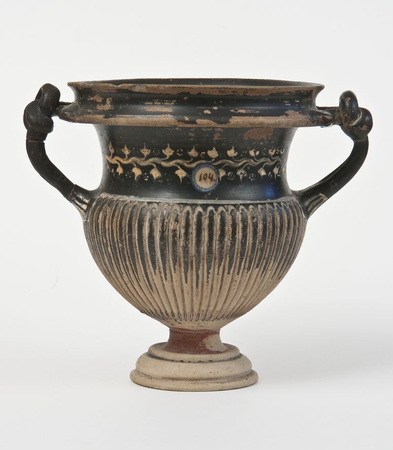 Kantharos a vernice nera con sovraddipinture in bianco e giallo. Spesso labbro revoluto, quasi bifido, orlo estroflesso, corpo a profilo concavo-convesso, strigilato, anse a nastro bifido, verticali, annodate all'estremità superiore, gola di raccordo, piede troncoconico cavo, sagomato all'esterno. Lato A e B: Sulla fascia liscia, sopra il corpo strigilato, tralcio di edera con stelo sinuoso dipinto e rosette di punti in giallo su base bianca. Le anse presentano alla base una fila di bastoncelli in giallo, pendenti da una linea orizzontale in bianco. Il piede è sovraddipinto con fila di punti, in bianco.