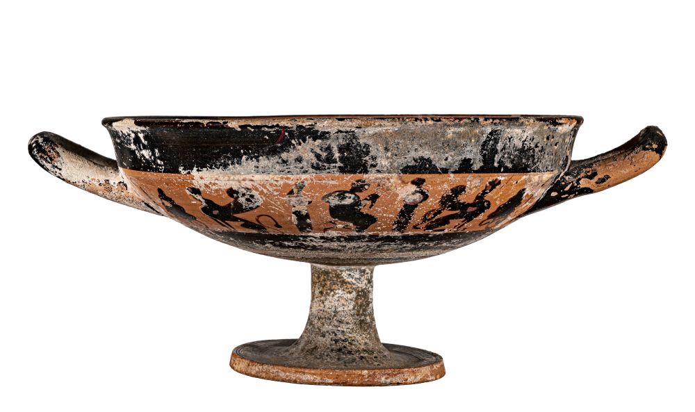 Kyilix attica a figure nere priva di colori aggiunti e graffito. Coppa a fascia distinta (Band-Cup). Lato A: fila di cavalieri al galoppo verso sinistra. ai lati delle anse palmette. Lato B: tra due sfingi contrapposte tre figure umane, delle quali la centrale seduta. Archetti avvolti a spirale. Rappresentazione molto sommaria