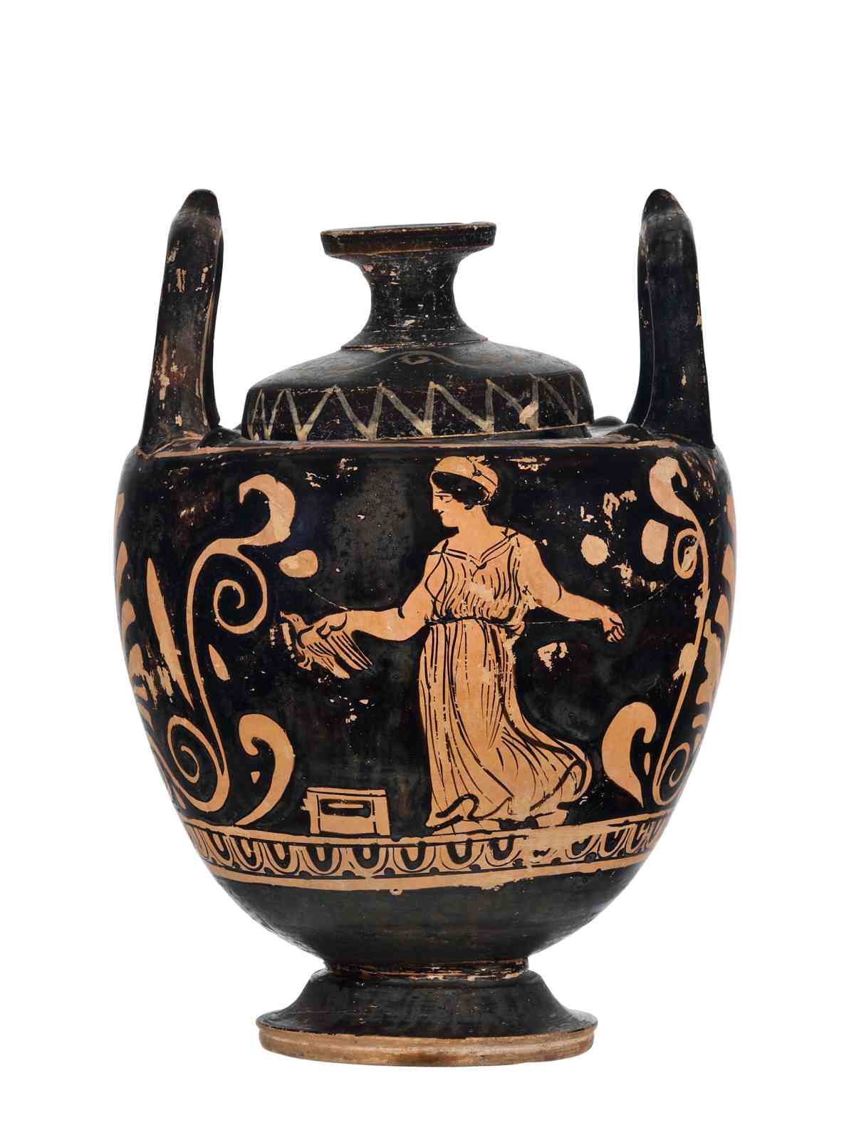 Argilla rosata (7.5 YR 7/4 Munsell); la vernice è lucente, di buona qualità, generalmente ben conservata ma scalfita, diluita abrasa in alcuni punti, per cui le immagini sovraddipinte si rivelano di difficile lettura. Si rilevano, inoltre, alcune piccole zone che evidenziano problemi di cottura. Il vaso presenta un corpo globulare leggermente rastremato nella parte bassa, con un'imboccatura non molto larga, su cui si imposta un breve labbro verticale. Sulle spalle del vaso sono presenti, su entrambi i lati, due piccole protuberanze, che sembrano quasi delimitare l' area sottostante, destinata alla decorazione figurata. Il vaso presenta poi una vasca non molto profonda, con fondo arrotondato che poggia su un piede a campana, delimitato superiormente da una sottile modanatura, la quale si ripresenta anche sul bordo superiore dello spessore del piede. Il vaso presenta, impostate verticalmente sulla spalla, alte anse a bastoncello, sulla cui sommità sono presenti delle piccole protuberanze. Decorazione del lato A: è raffigurata una figura femminile con il volto di profilo e i piedi rivolti verso sinistra, e con il corpo e le gambe di prospetto; porta i capelli raccolti in un sakkos ed è vestita di un chitone smanicato ricco di drappeggi che, stretti alla vita, le segnano le linee del corpo. A sottolineare le pieghe della stoffa vi sono delle sottili bande più scure. La donna tiene il braccio sinistro sospeso elegantemente a mezz'aria, mentre tiene stretta nella mano destra una colomba. Ai suoi piedi, sulla sinistra, è raffigurata una piccola cassetta. Decorazione del lato B: la scena mostra un giovane nudo, con il volto di profilo verso sinistra e con il corpo e le gambe di prospetto, che porta i capelli corti, con una ciocca che gli ricade all'altezza degli zigomi. L'unico indumento è il mantello, portato sulla spalla e sul braccio sinistri per poi ricadere lungo il fianco, i cui drappeggi sono sottolineati lungo il bordo inferiore da una banda più scura. Nella mano destra il giovane regge un bastone a metà altezza. La decorazione accessoria è costituita da due palmette tra girali fogliati, che riempiono lo spazio sotto le anse. Un sottile filetto risparmiato corre lungo la linea ideale tra le due protuberanze sulla spalla; alla base delle scene figurate, sotto un ulteriore filetto risparmiato che funge quasi da linea di appoggio per le figure principali delle scene, corre lungo tutta la circonferenza del vaso una fascia decorata dalla sequenza ovulo-guscio e puntino, sottolineata da un'altra spessa linea risparmiata. Un sottile filetto graffito decora il punto di stacco tra ventre e piede. Il coperchio è in argilla rosata (7.5 YR 7/4 Munsell) e presenta un foro rotondo sull'estremità superiore della presa cilindrica, staccata dal coperchio per mezzo di una modanatura sottilissima sottolineata da un filetto graffito. Vi è una seconda modanatura sottilissima proprio nel punto di attacco tra il corto stelo della presa ed il coperchio. È presente, attorno al foro sulla presa, una decorazione a linee radiali, mentre la base del coperchio è ornata con una linea continua a zig zag, che corre lungo tutta la circonferenza.