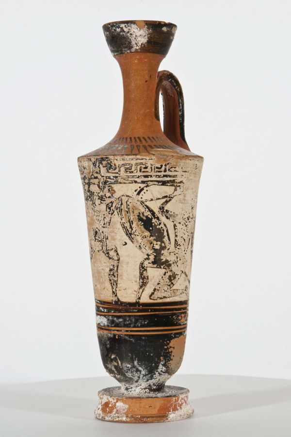Lekythos attica a figure nere con graffito. Combattimento di tre guerrieri armati di scudo, lancia ed elmo. Decorazione a meandri e linee verticali.