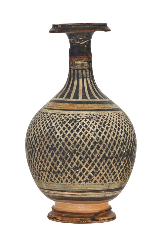 Bombylios o unguentario a bottiglia a vernice nera lucente con sovraddipinture in bianco crema e giallo. Stretto e basso collo, corpo globulare espanso superiormente e rastremato verso il basso, bassa gola di raccordo, piede troncoconico con taglio modanato. Una sottile linea dipinta in bianco crema cinge la parte più stretta del collo, seguita da bastoncelli racchiusi superiormente e inferiormente da due linee, sempre in bianco crema. Sulla spalla fascia dipinta in giallo su base bianca, sul corpo motivo con reticolo a maglia romboidale sovraddipinto in bianco e inquadrato da due linee bianche.
