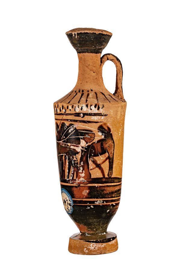 Lekythos attica a figure nere con tracce di colore bianco ma prive di graffito. Scena di partenza di carro o quadriga nuziale. Una figura femminile, probabilmente una divinità, di profilo, sale sulla quadriga; ha il capo coperto ed è vestita con un lungo himation drappeggiato, accanto si trova un’altra figura simile. Al centro della scena i cavalli sono già bardati e sul fondo si intravede un personaggio vestito con una lunga veste, la cui identificazione è incerta. Davanti alla quadriga, un’altra figura femminile seduta su un diphros. Il colore bianco è usato per i volti delle donne. I particolari a graffito sono molto approssimativi: i profili dei cavalli e le loro code, i drappeggi delle vesti.