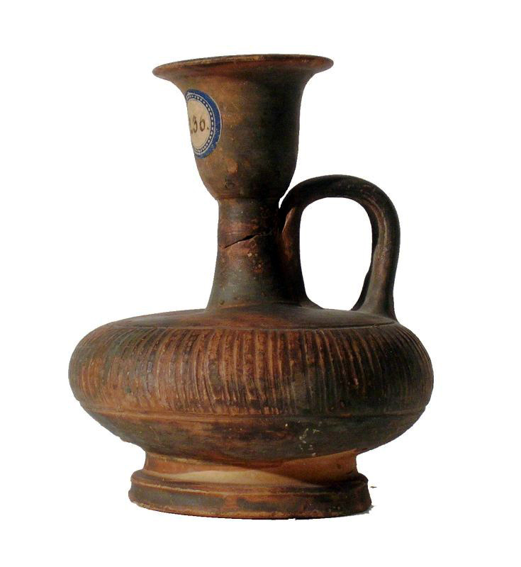 lekythos in argilla rosa con imboccatura campaniforme, collo stretto a lati concavi, corpo molto espanso e schiacciato con piede modanato, ansa verticale a nastro. Baccellatura sul ventre, vernice bruna priva di sovraddipinture