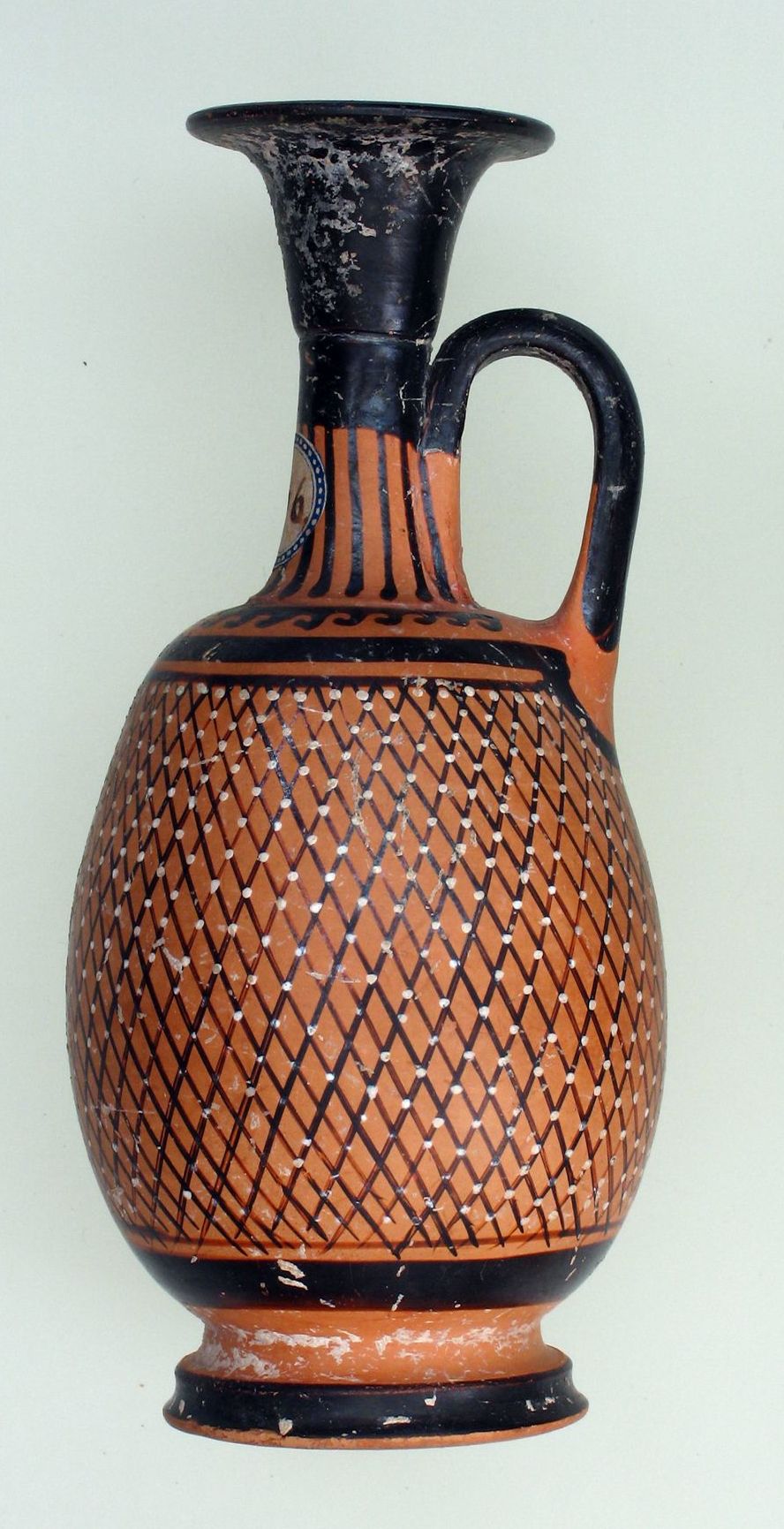 Lekythos apula con decorazione a reticolo nero e nel punto di contatto puntini bianchi.