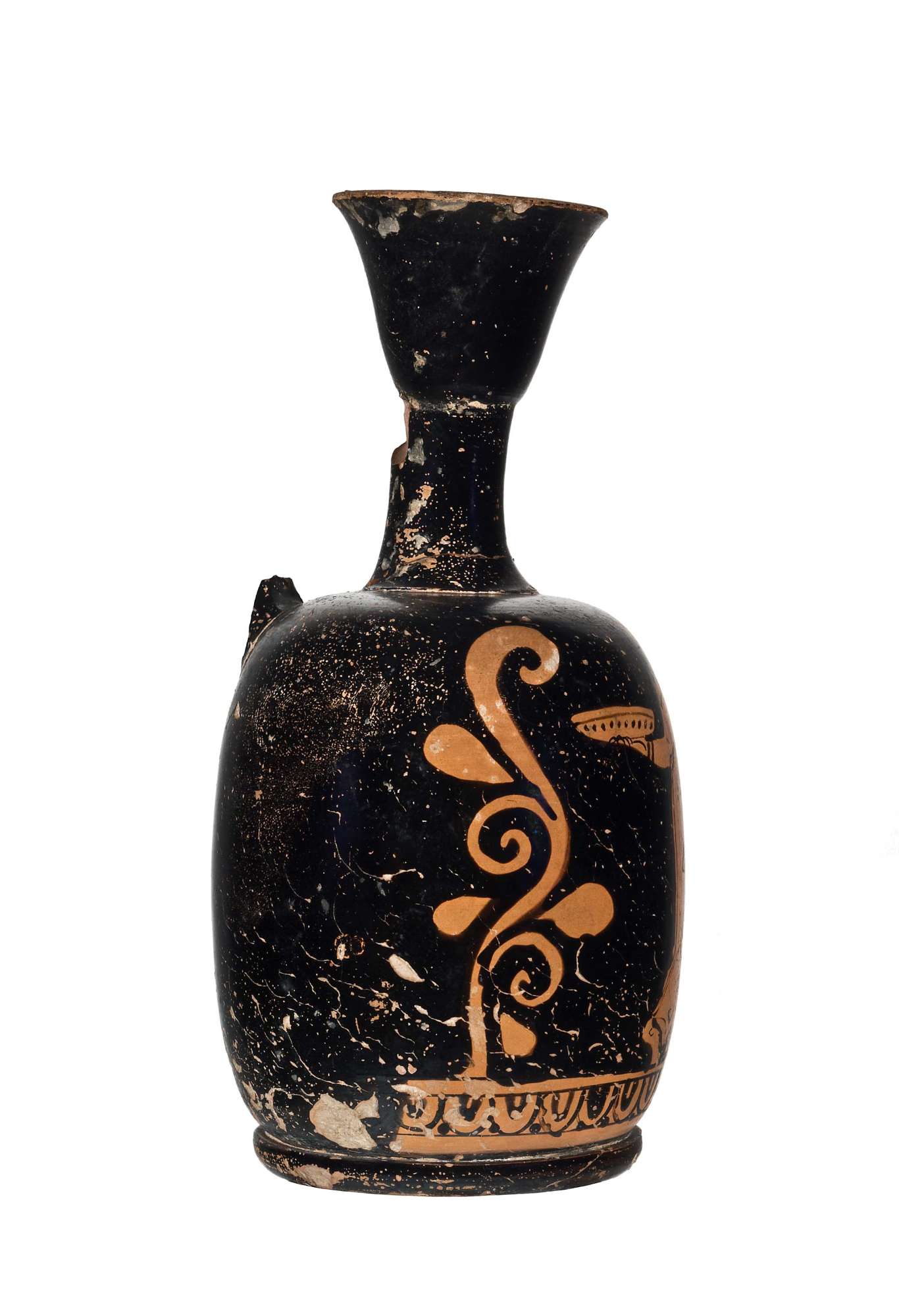Largo bocchello svasato a profilo concavo-convesso con labbro estroflesso e distinto. Alla base della scena figurata, entro fascia risparmiata, motivo ad ovuli, gusci e punti inframezzati, tra due linee a vernice nera, quella superiore più spessa e quella inferiore più sottile. Lato A: figura femminile con phialè presso ara. Figura femminile stante, ritratta frontalmente con testa di profilo verso s.; ponderata sulla gamba destra, tiene la sinistra incrociata sul davanti con piede di profilo. Appoggia il gomito sinistro su un’ara parallelepipeda, mentre nella destra regge una patera decorata da una sottile linea e da una corona di linguette a vernice nera. Indossa un lungo chitone smanicato, bordato di nero, agganciato sulle spalle e stretto in vita da una cintura con apoptygma sui fianchi. I capelli sono raccolti in uno chignon; al collo, collana ad unico filo di vaghi e armilla a vernice nera. Contornano la figura lateralmente una coppia di vegetali con foglie falcate e spiraliformi e con infiorescenze.