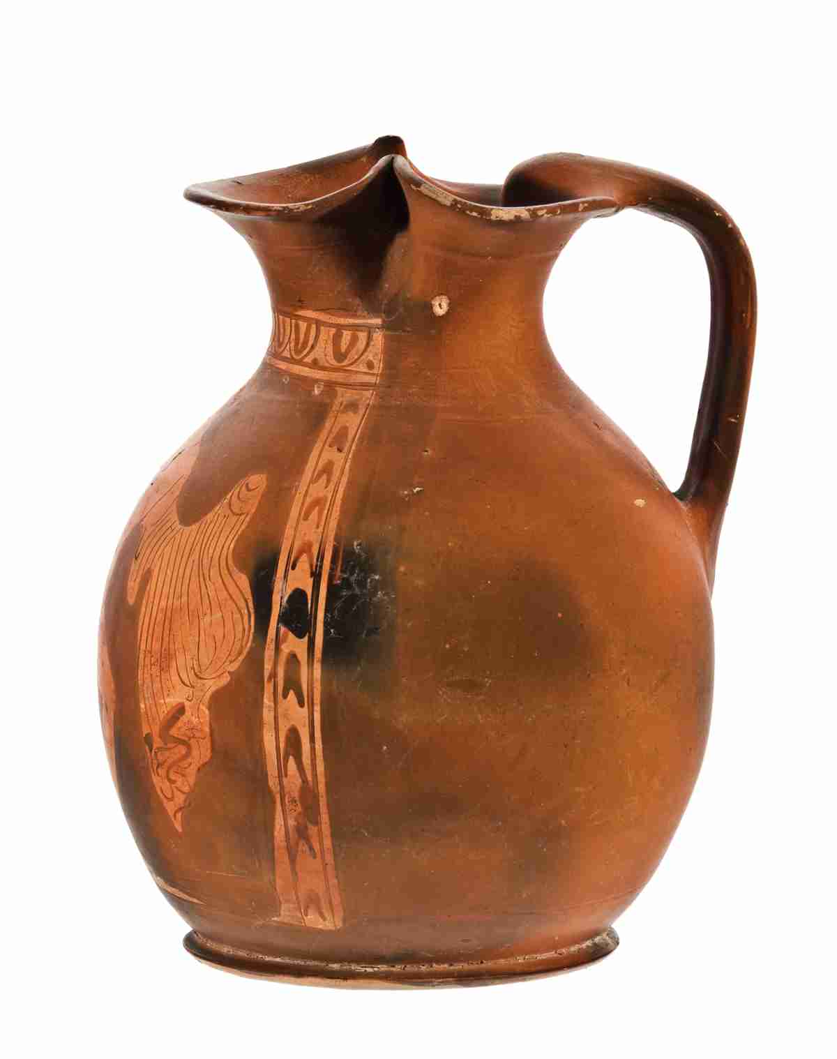 La bocca del vaso è trilobata, con tre lobi ben distinti, l'orlo estroflesso, con labbro arrotondato semplice; Il collo è corto e indistinto e si congiunge ad un corpo globulare, che poggia su un piede ad anello. L'ansa a nastro si imposta verticalmente al di sopra dell'orlo del vaso e sulla parte mediana del corpo. La vernice nera, soprattutto sul retro della brocca, appare fortemente arrossata, probabilmente a causa di problemi di cottura (Munsell 2.5YR 4/6, red); anche l'interno del collo è dipinto. Pochi dettagli sono resi con una sovradipintura bianca. Il colore dell'argilla è oscillante tra Munsell 2.5YR 6/6 (light red) e 2.5YR 5/6 (red). Il motivo principale, racchiuso in una sorta di cornice, presenta un giovane nudo, stante, con il volto di profilo a sinistra, il torso frontale, così come la gamba destra, distesa: il corpo poggia sulla gamba sinistra, piegata, conferendo quindi una posa protesa verso destra. I tratti del volto, così come la muscolatura, sono resi in maniera piuttosto sommaria; sul capo, dai capelli corti e ricciuti, porta una benda o un diadema, sovradipinto in bianco. Il braccio destro è proteso verso sinistra, leggermente flesso e rappresentato di tre quarti, mentre il sinistro è avvolto in un mantello, con molte pieghe riprodotte in maniera molto schematica con una serie di linee parallele. A completare la composizione, a sinistra del giovane nudo, un girale fogliato e fiorito. È presente anche un piano di appoggio delle figure, un terreno brullo. A fare da cornice alla composizione centrale, una striscia ad ovuli intervallati da punti, inquadrata da due filetti a risparmio e, verticalmente, un motivo a V rovesciata, ugualmente limitato da linee nere e fasce a risparmio. Inoltre, sopra la testa della figura, una fila di punti bianchi.