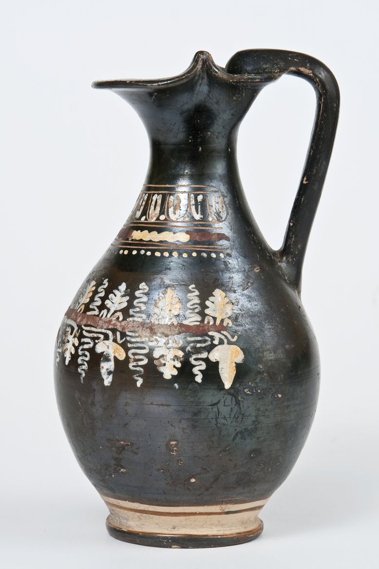 Oinochoe a vernice nera lucente con sovraddipinture in bianco, giallo oro, rosso amaranto ed incisioni. Orlo trilobato, stretto collo a profilo concavo, corpo globulare, ansa a nastro leggermente obliqua che al punto d’attacco sull'orlo presenta una protuberanza, stilizzazione di una protome, basso piede ad anello. Sul collo: tra tre coppie di linee incise, sequenza di ovuli incisi e dipinti con punti, tremuli giallo-rossi e fila di punti. Sul corpo: tralcio di vite con stelo rosso, grappoli, pampini, viticci e germogli.