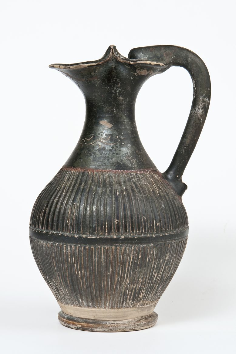 Oinochoe a vernice nera con sovraddipinture in bianco, giallo, rosso amaranto ed incisioni. Orlo estroflesso e trilobato, stretto collo a profilo concavo, corpo globulare (particolarmente espanso al centro) strigilato, con fascia lisca tra le strigilature, ansa a bastoncello verticale, desinente alla sommità, nel punto d’attacco all’orlo, in una protuberanza, stilizzazione di una protome, piede ad anello. Ciò che resta di una presunta decorazione è soltanto un ramo inciso, probabilmente appartenente al tralcio d’edera rappresentato con stelo sinuoso inciso e rosette di punti. Una linea in rosso amaranto inquadra superiormente il corpo strigilato.