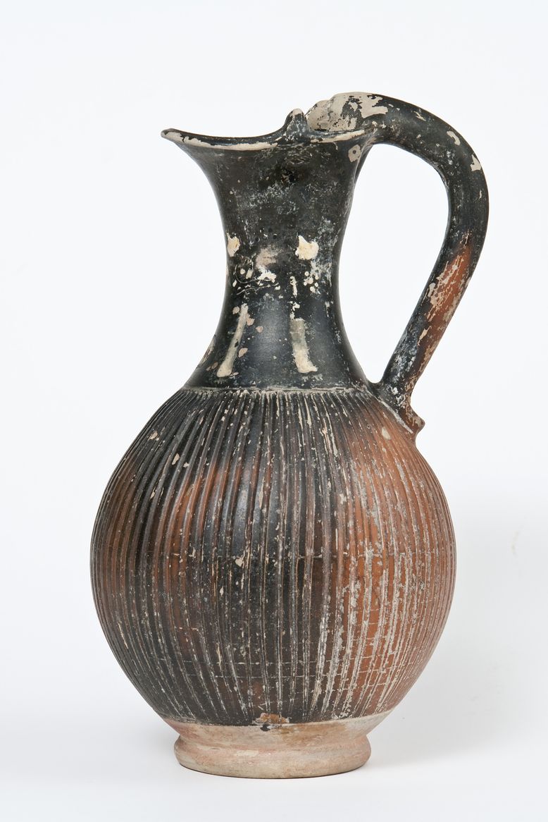 Oinochoe a vernice nera, a tratti tendente al rosso, con sovraddipinture in bianco crema e giallo. Orlo estroflesso e trilobato, collo a profilo concavo, corpo globulare strigilato, ansa a bastoncello verticale desinente alla sommità, nel punto di attacco all’orlo, in una protome ferina, piede ad anello. Sul collo tralcio di edera, con stelo sinuoso dipinto e rosette di punti, dal quale pende un ramo secco con stelo dipinto e foglie puntiformi, ed una benda, tutto dipinto in giallo su base bianca. Una linea dipinta di bianco inquadra superiormente il corpo strigilato.