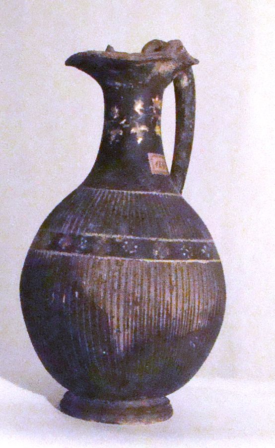 Oinochoe a vernice nera con sovraddipinture in bianco e giallo. Labbro modanato, orlo estroflesso e trilobato, stretto collo a profilo concavo, corpo globulare strigilato, con fascia liscia tra le strigilature, ansa a bastoncello verticale desinente alla sommità, nel punto d’attacco all’orlo, in una protome leonina, bassa gola di raccordo, basso piede troncoconico modanato. Sul collo: tralcio di vite in giallo, da cui pende un tralcio di edera con stelo sinuoso dipinto verticale. Una linea dipinta in bianco delimita superiormente il corpo strigilato. Sulla fascia liscia tra le strigilature, evidenziata da una coppia di linee dipinte in bianco, sequenza di rosette di punti, alternate a croci e foglia di edera in giallo.