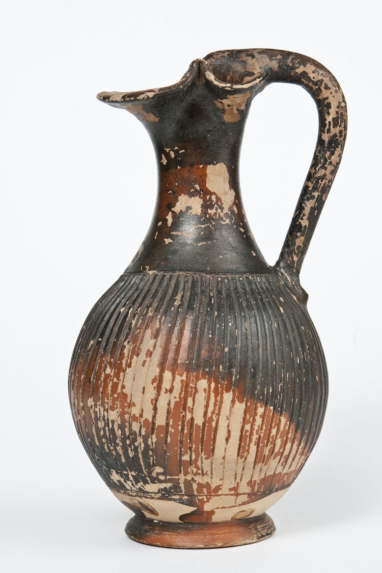 Oinochoe a vernice nera tendente al rosso con sovraddipinture. Labbro modanato, orlo estroflesso e trilobato, stretto collo a profilo concavo, corpo globulare strigilato, ansa a bastoncello verticale desinente alla sommità, nel punto d’attacco all’orlo, in una protome leonina, piede ad anello leggermente modanato. Dalle tracce lasciate dal colore sulla superficie del vaso si capisce che il motivo decorativo presente sul collo era un tralcio di edera, con stelo sinuoso dipinto e rosette di punti.
