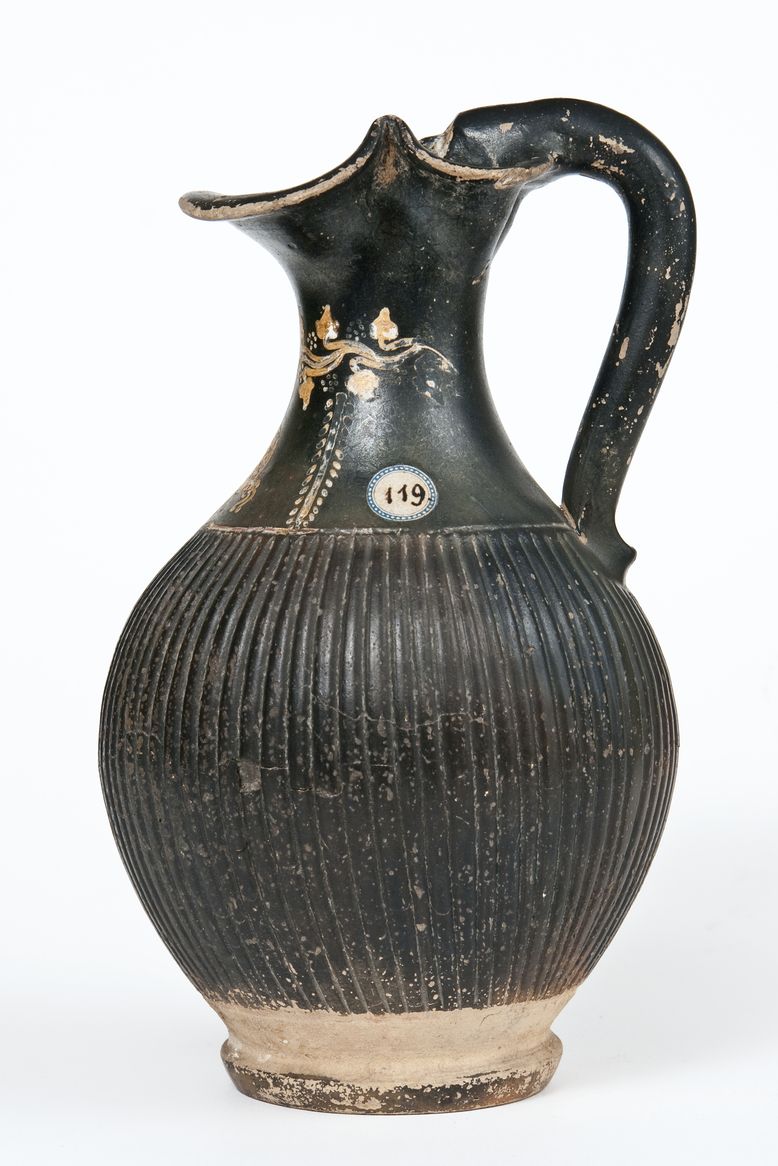 Oinochoe a vernice nera tendente al rosso, con sovraddipinture in bianco, giallo, rosso ed incisioni. Orlo estroflesso e trilobato, collo a profilo concavo, corpo globulare strigilato, ansa a bastoncello verticale leggermente sopraelevata e terminante in una protome leonina, presso l’attacco superiore, piede ad anello. Sul collo: tralcio di edera con stelo sinuoso dipinto ed inciso e rosette di punti in giallo su base bianca, da cui pendono due rami di alloro, che inquadrano una maschera pendente, a sua volta, dal tralcio. La maschera è di profilo verso sinistra, in bianco con dettagli incisi e campiti di giallo. La linea incisa, che delimita superiormente il corpo strigilato, è campita in rosso su base bianca. La protome leonina presenta tracce di sovraddipintura in giallo su base bianca.