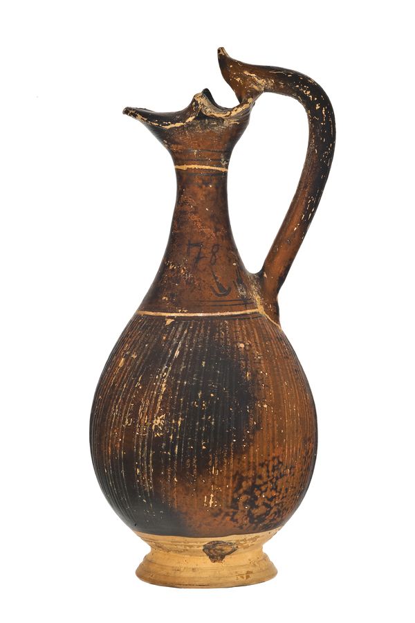Oinochoe a vernice nera, tendente al rosso, sovraddipinture. Labbro leggermente modanato, orlo trilobato ed estroflesso, stretto collo a profilo concavo, corpo globulare strigilato, ansa a bastoncello verticale leggermente sormontante e terminante con una stilizzazione di protome, piede troncoconico. Decorazione evanide a linee e foglie di palma.