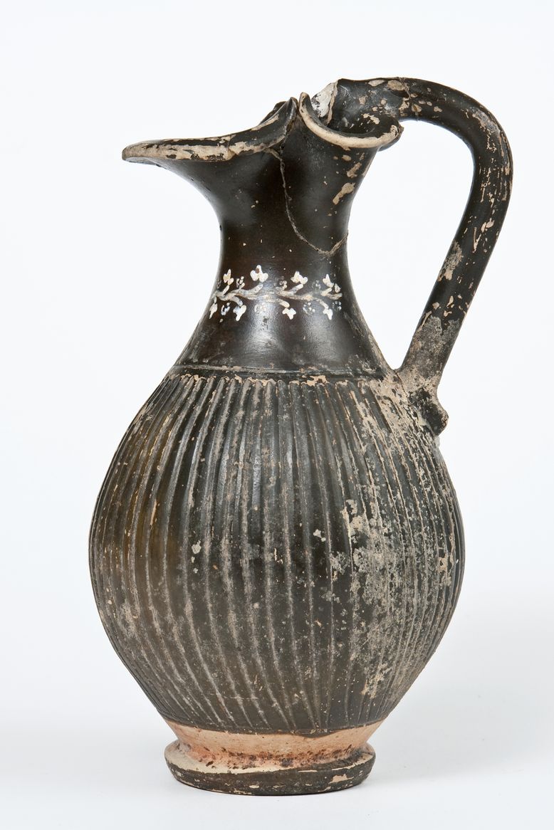 Oinochoe a vernice nera con sovraddipinture in bianco e giallo. Orlo estroflesso e trilobato, collo a profilo concavo, corpo globulare strigilato, ansa a bastoncello verticale desinente alla sommità, nel punto d’attacco all’orlo, in una protome leonina, piede ad anello. Sul collo: tralcio di edera con stelo sinuoso dipinto e rosette di punti e petali a semicerchio, in giallo su base bianca.