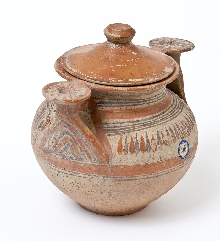 Olla con coperchio in ceramica messapica. Anse verticali in forma di scalpello unite al labbro mediante rotella, basso collo troncoconico a profilo convesso, corpo biconico, apoda a base piana. Decorazione bicroma in rosso e bruno su fondo di argilla naturale. Su entrambi i lati, sul collo, riquadro con motivo a tremulo e linee parallele; sulla spalla, riquadro con linee parallele e fascia di foglie lobate brune e rosse alternate; sul ventre, fascia rossa e linee brune; sulle rotelle, dipinte in rosso, giro di foglie in chiaro uscenti dal centro di esse, incavato; orlo e base interamente dipinti. Coperchio con pomello a sezione biconica, con estremità piatta.