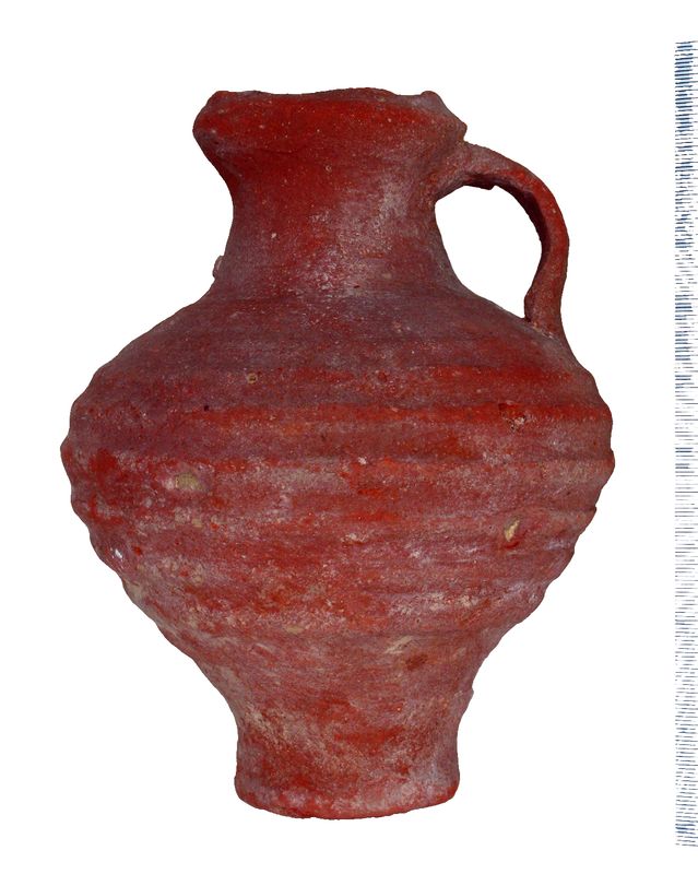 Piccola olpe n argilla grezza con piede leggermente allargato, corpo biconico decorato da scanalature sul ventre e con una piccola ansa a nastro; orlo leggermente proteso a formare un beccuccio.