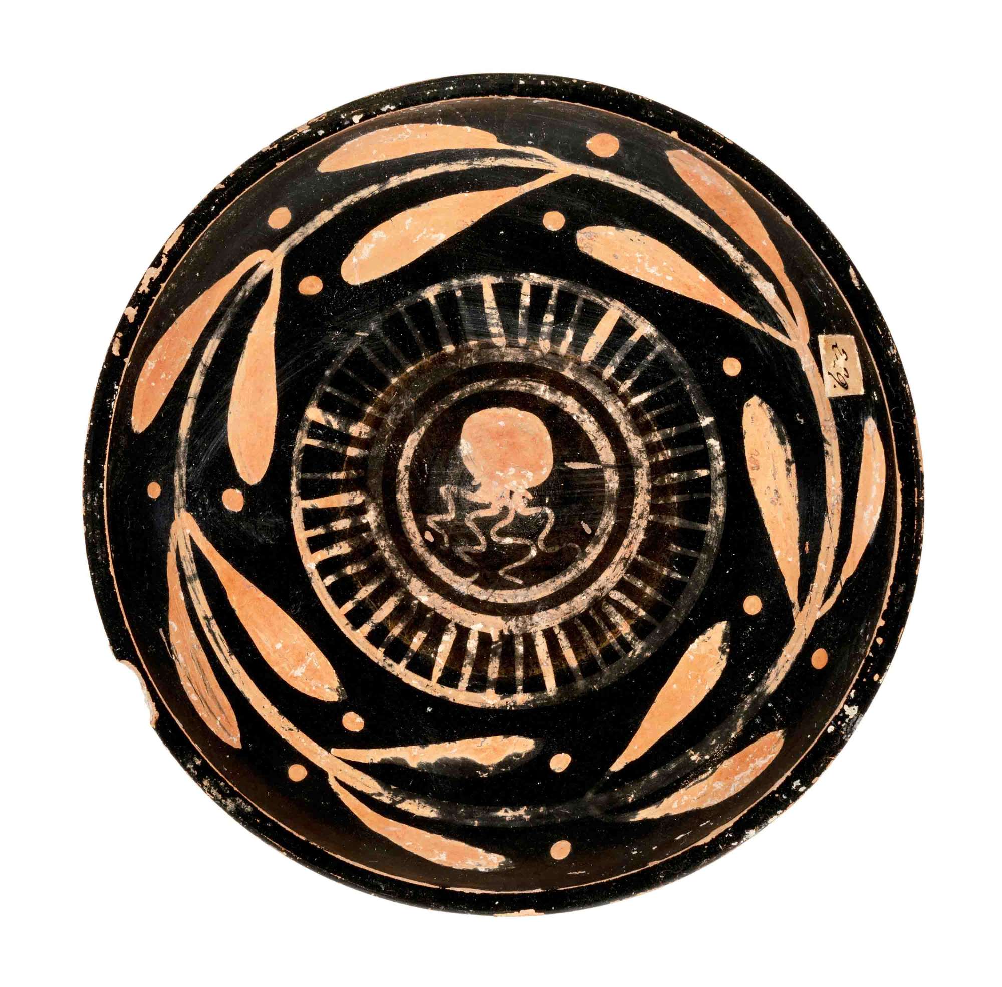 Piatto a figure rosse con polipo al centro e ramo d'alloro attorno.