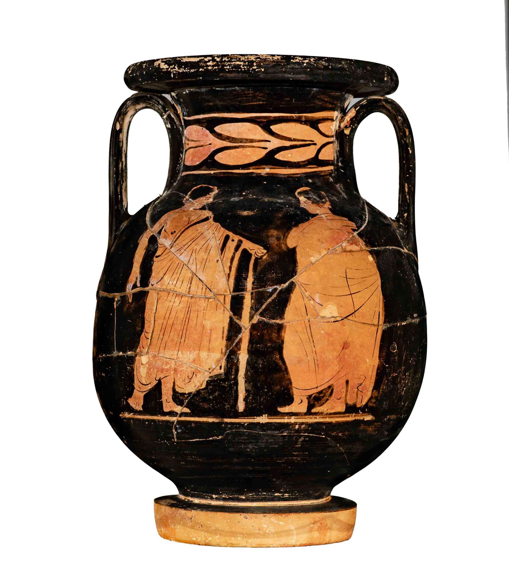 Pelike apula a figure rosse. Lato A: giovane nudo con bastone, figura femminile con serto. Lato B: due figure maschili ammantate.
