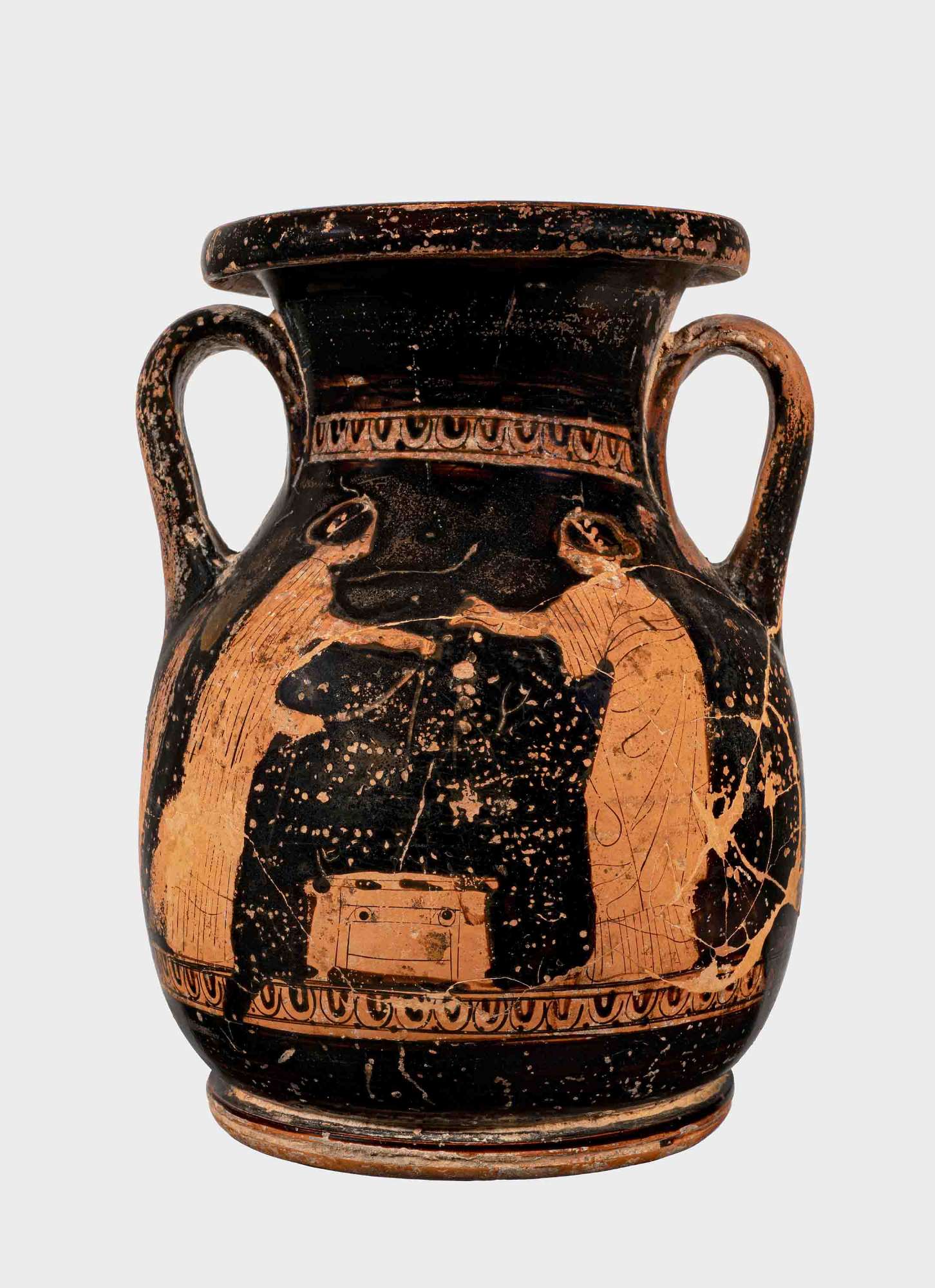 Pelike attica a figure rosse. Lato A: due figure femminili ai lati di una cassettina; sopra e sotto fascia di ovuli. Lato B: figura femminile stante.
