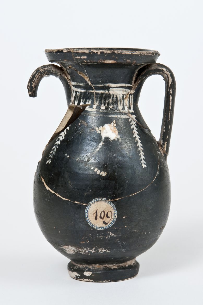Pelike a vernice nera con sovraddipinture in bianco crema e giallo. Labbro leggermente revoluto, orlo estroflesso, collo a profilo concavo, corpo globulare, anse a nastro verticali, quasi adiacenti al labbro, basso piede ad anello. Sul collo: tra due coppie di linee dipinte sequenza di ovuli allungati, dipinti in bianco; dall’ultima linea pendono due rami secchi verticali che vanno ad inquadrare uno specchio, disposto obliquamente su una fila di punti al centro del corpo, presumibilmente in giallo su base bianca.