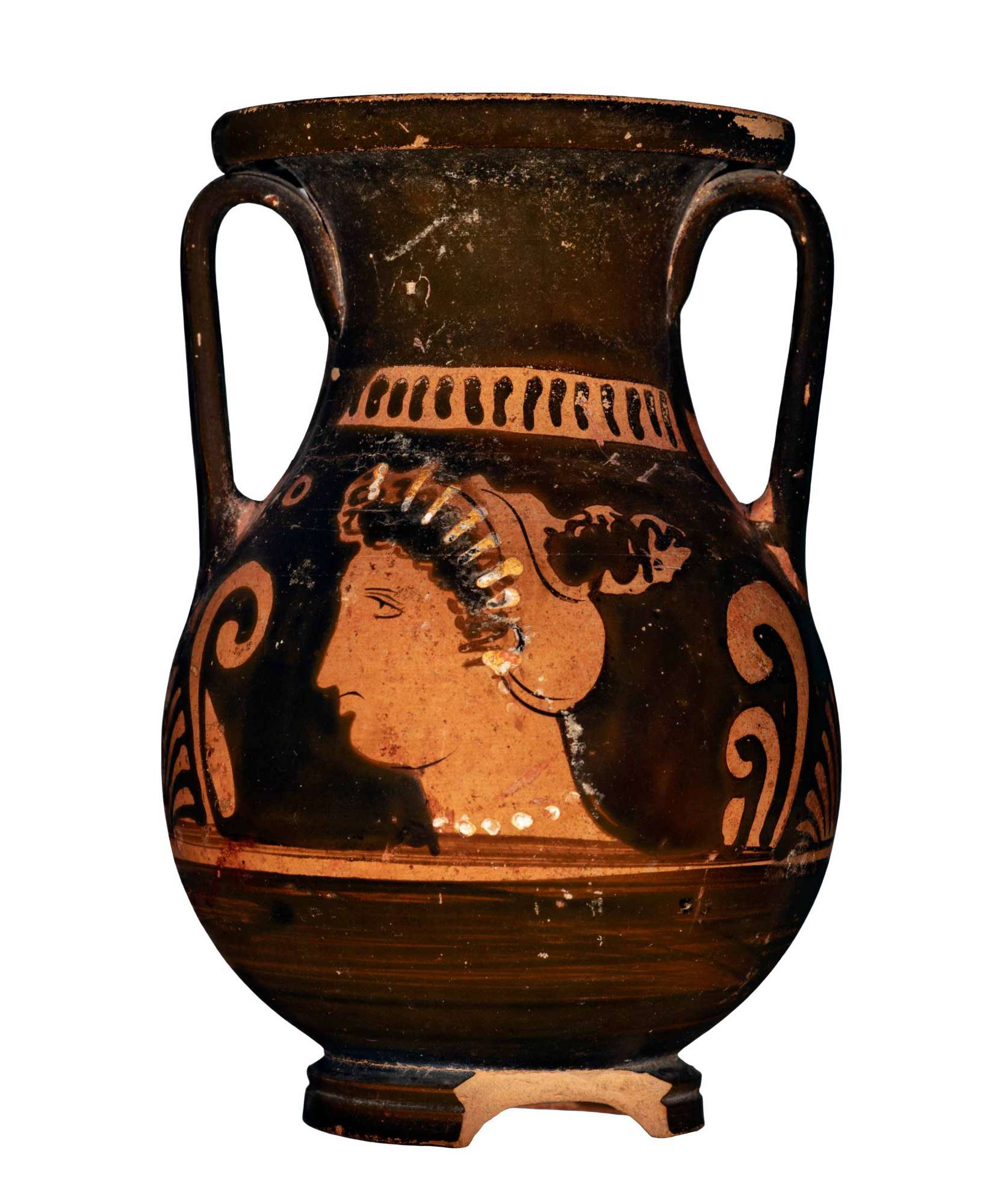 Orlo revoluto su collo a profilo concavo; spalla obliqua; corpo ovoide, distinto da una sottile linea graffita; anse verticali a nastro con lievissima costolatura mediana, impostate tra collo e spalla; Lato A: testa femminile con stephanè Testa femminile di profilo rivolta verso sinistra. Fronte e naso costituiti da un’unica linea continua; mezzo di una breve linea a vernice nera tendente verso il basso. Il mentoè abbastanza stondato. Un sakkòs, decorato sulla nuca con una corona di linguette e lungo la circonferenza da una doppia linea continua a vernice nera diluita e da una fila di pallini in vernice nera, copre i capelli, di cui fuoriesce solo una ciocca di riccioli neri all’altezza dell’orecchio. Al sakkòs è sovrapposta una stephanè ad alti raggi in bianco e giallo sovradipinto; indossa collana ad unico filo di vaghi circolari sovradipinti in bianco (in parte evanidi) e orecchini a rosetta costituiti da tre vaghi circolari accostati, in bianco e giallo sovradipinto.  Nel campo, ai due lati della testa femminile, in alto, due rosette quadripetale  Lato B: testa femminile con stephanè, il disegno rimanda lo stesso del lato A.