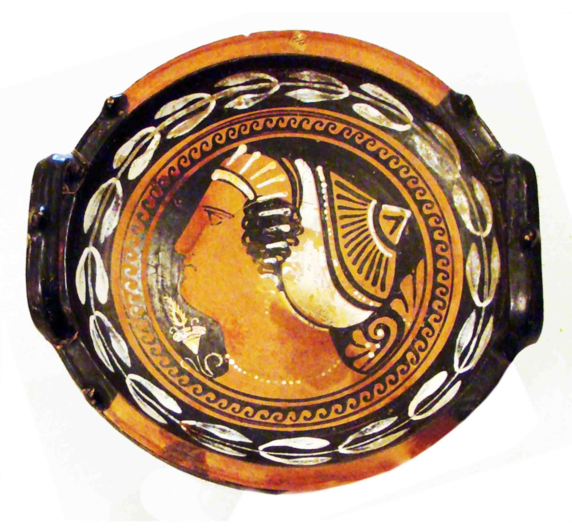 Phiale apula a figure rosse e dettagli sovradipinti in bianco. Interno testa femminile con mitella circondata da fascia a onda marina corrente e ramo d'ulivo.