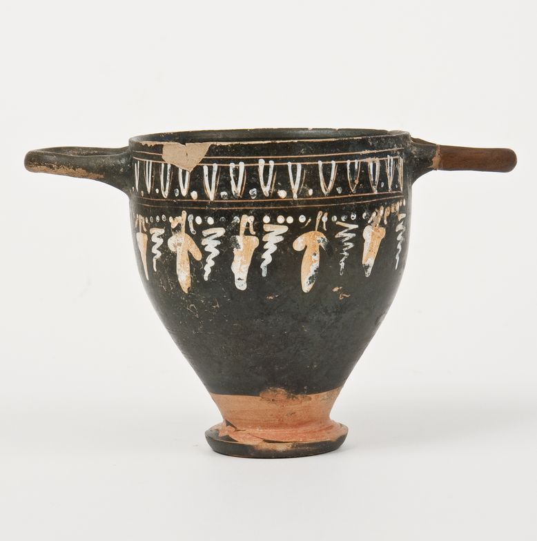Skyphos a vernice nera, tendente all'olivastro, con sovraddipinture in bianco e giallo ed incisioni. Orlo leggermente estroflesso, corpo rastremato verso il basso, anse a bastoncello, impostate orizzontalmente sotto l'orlo, basso piede ad anello sagomato. Lato A: Sotto l'orlo, tra due coppie di linee incise, sequenza di ovuli incisi e dipinti con punti in bianco, grappoli, pampini e viticci, in bianco e giallo, pendenti da una fila di punti, in giallo su base bianca. Lato B: Sotto l'orlo ramo secco con stelo inciso e foglie puntiformi.