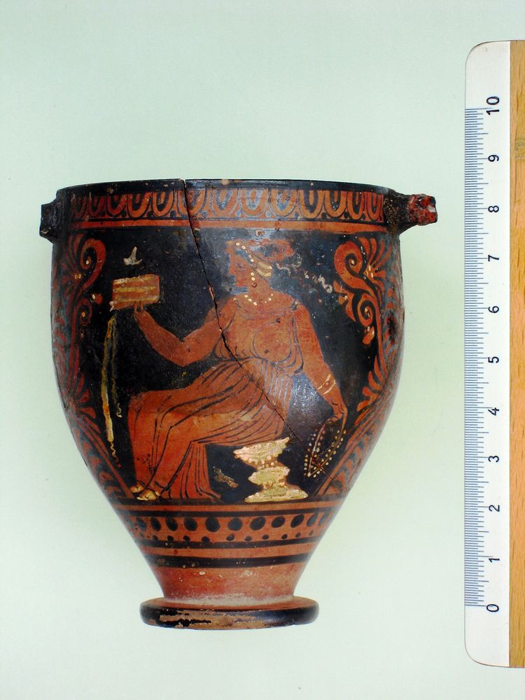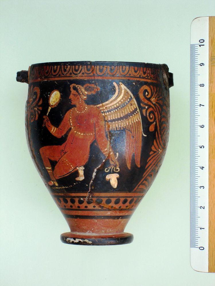 Skyphos apulo a figure rosse e dettagli bianchi biansato a profilo concavo-convesso allungato. Lato A: Eros con ginocchio a terra con specchio e grappolo d'uva. Lato B: donna in chitone seduta con serto e cista con foglia d'edera.