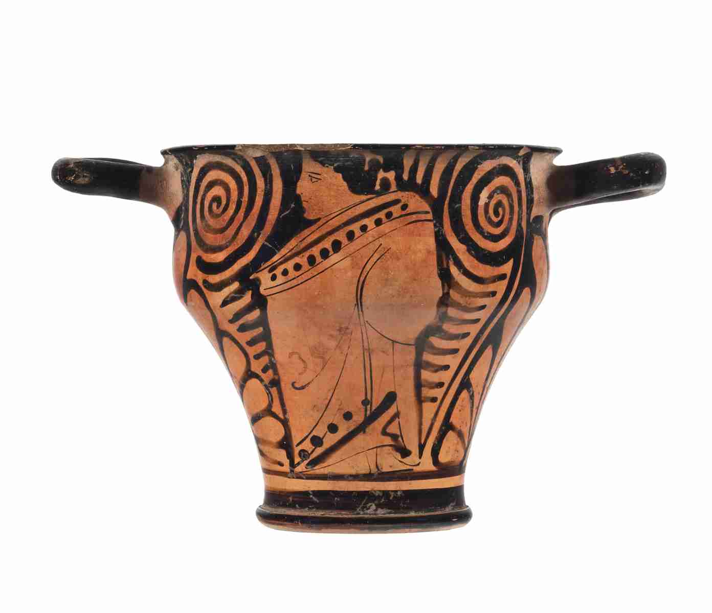 Lo skyphos presenta un corpo situliforme, con un accenno di orlo estroflesso e piede a disco semplice. Le anse a nastro si impostano orizzontalmente poco sotto l'orlo. La vernice nera, tendenzialmente opaca, è uniforme e copre interamente la vasca del vaso, il piede e le anse, risparmiandone però la base e il retro. Il colore dell'argilla varia da Munsell 7.5YR 7/6 (reddish yellow) a 2.5YR 4/6 (red). I due lati presentano una decorazione analoga e quasi simmetrica, con la tozza figura di un giovane ammantato, leggermente più accurata sul lato A. il giovane è perfettamente di profilo a sinistra, con i capelli ricciuti che rica-dono sulla nuca. L'himation copre completamente le forme del corpo e presenta gli orli superiore e inferiore decorati da una fascia nera e una fila di punti; sul lato A il drappeggio del mantello è più accurato e la decorazione più ricca. La decorazione accessoria è composta da palmette sotto le anse, affiancate da coppie di elementi vegetali a foglia con estremità a spirale, estesi fino a fare da sfondo alle figure ammantate. Sotto al piede è presente una decorazione composta da tre cerchi concentrici in nero. Sotto il piede si conserva una vecchia etichetta, recante un precedente numero di inventario ('550') ed è scritto l'attuale numero di inventario generale. Sul lato B, sulla figura, si intravede una scritta, quasi illeggibile ('347').