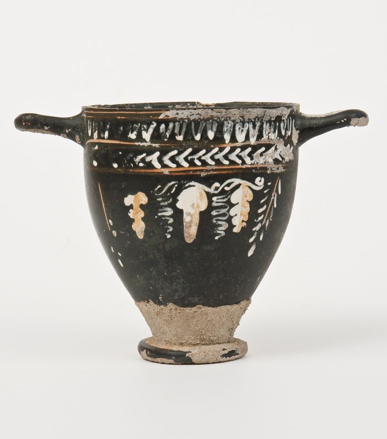 Skyphos a vernice nera opaca con sovraddipinture in bianco crema e giallo ed incisioni. Orlo leggermente estroflesso, corpo rastremato verso il basso, anse a bastoncello impostate orizzontalmente sotto l'orlo e andamento quadrangolare, basso piede ad anello sagomato. Lato A: Sotto l'orlo, tra le coppie di linee incise, sequenza di ovuli dipinti e Chevron in bianco, seguiti da un tralcio di vite reso attraverso un grappolo centrale, pampini e viticci, dipinti per metà in bianco e metà giallo, tra due rami di alloro con stelo inciso, disposto obliquamente verso l'interno. Lato B: Sotto l'orlo, ramo di ulivo selvatico.