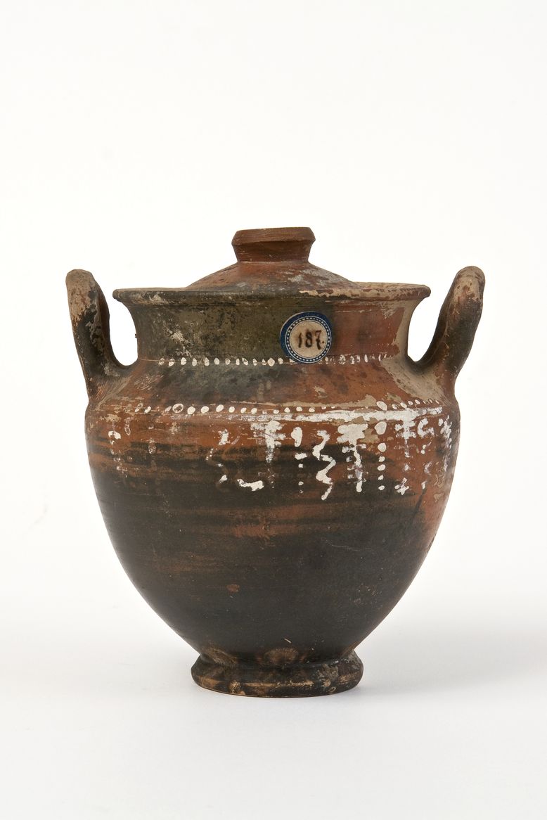 Lebes gamikos o stamnos a vernice nera sovraddipinta con coperchio