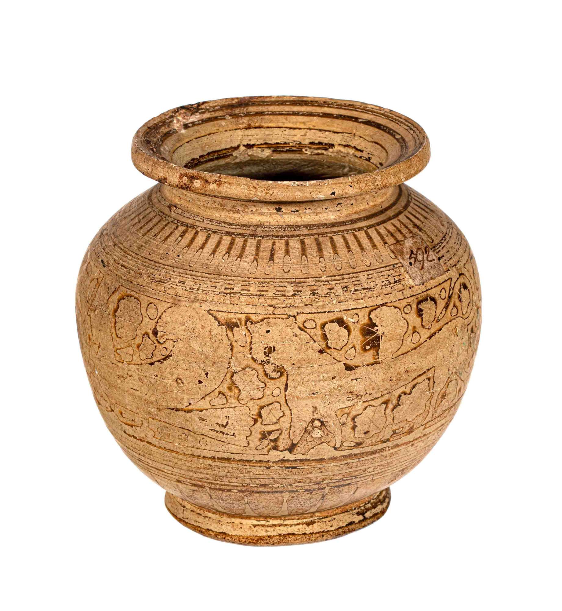 Pisside corinzia a corpo sferico, bassa base e orlo estroflesso, mancante del coperchio; decorazione a fasce con una zona di animali: due sirene e due pantere con in mezzo cigno. Nel campo rosette; sopra e sotto raggiere di petali.