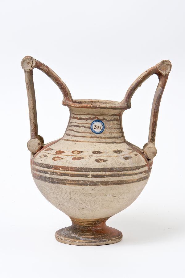 Trozzella in ceramica messapica. Orlo estroflesso e appiattito, alto collo cilindrico, a profilo lievemente concavo, corpo globoso, con anse verticali sormontanti, impostate sull’orlo e sulla spalla, provviste di doppia coppia di dischi (“trozze”) di eguali dimensioni; piede a disco, unito al corpo mediante fusto. Decorazione monocroma in rosso, su fondo naturale di argilla, con piede e fusto interamente dipinti; sul collo, linee orizzontali diritte e “a tremulo”; sulla spalla, un ramo d’ulivo in entrambi i lati. All’altezza del ventre una fascia a tre linee parallele; sull’orlo, tratti; sulle anse, linee verticali.