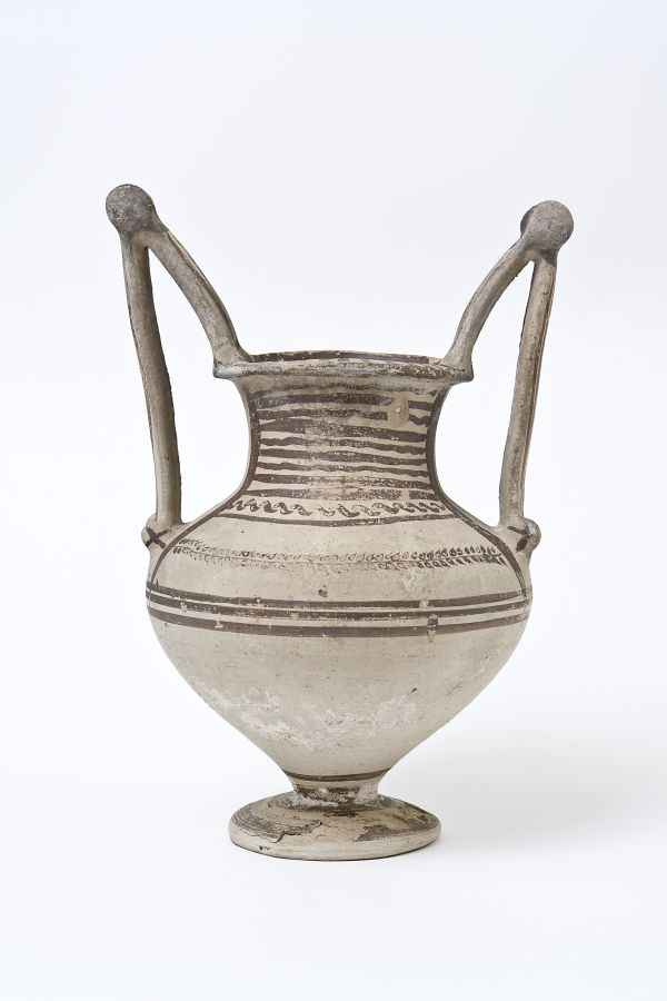 Trozzella in ceramica messapica. Orlo estroflesso e appiattito, alto collo cilindrico, a profilo leggermente concavo, corpo globoso, con anse verticali sormontanti, impostate sull’orlo e sulla spalla, provviste di doppia coppia di dischi (“trozze”), di cui quelli superiori sono di maggiori dimensioni; piede a disco, unito al corpo mediante un piccolo fusto. Decorazione monocroma in bruno su fondo naturale di argilla, con piede dipinto; risparmiata la costa laterale del piede; sul collo, linee orizzontali diritte e motivo a reticolo in quella inferiore; sulla spalla, una serie di pannelli definiti da linee parallele, in cui su un lato campeggiano due palmette laterali e un’anfora al centro, mentre sull’altro un ramo di ulivo. All’altezza del ventre, una fascia a tre linee parallele; sul fusto del piede, fasce e una linea; sull’orlo, tratti; sui dischi linee radiali.