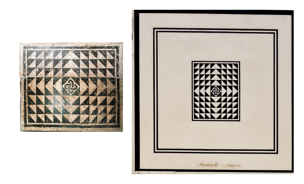 Mosaico in due pannelli della Seconda fase edilizia; appartenuto al cubicolo (stanza da letto) B’, del lato orientale del peristilio, che aveva questo pavimento a mosaico con disegno a piramide formata da triangoli bianchi su fondo nero; al centro un nodo di Salomone nero in un quadrato bianco. Il riquadro era inserito in una larga fascia bianca con doppia cornice nera e bordo, anch’esso nero, alle pareti.