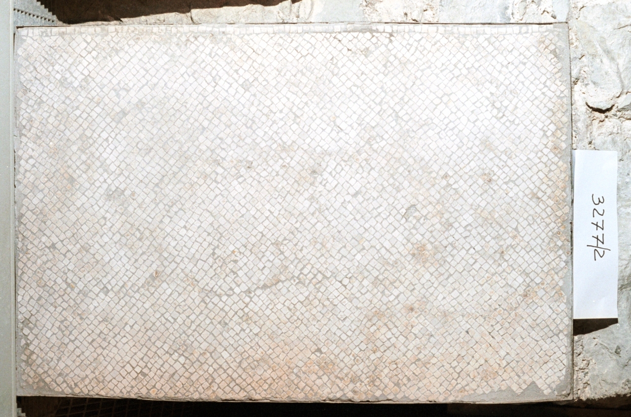Due pannelli di mosaico a tessere bianche della prima fase edilizia.
