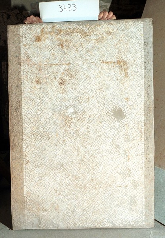 Un pannello (vedi anche inv. 3250) del mosaico della prima fase edilizia appartenuto all’ambiente G, aperto sul portico del giardino, aveva questo pavimento mosaicato a tessere bianche con al centro una stretta fascia a tessellato nero con fitti inserti di marmi venati e ciottoli fluviali bianchi e rossi screziati, disposti irregolarmente.